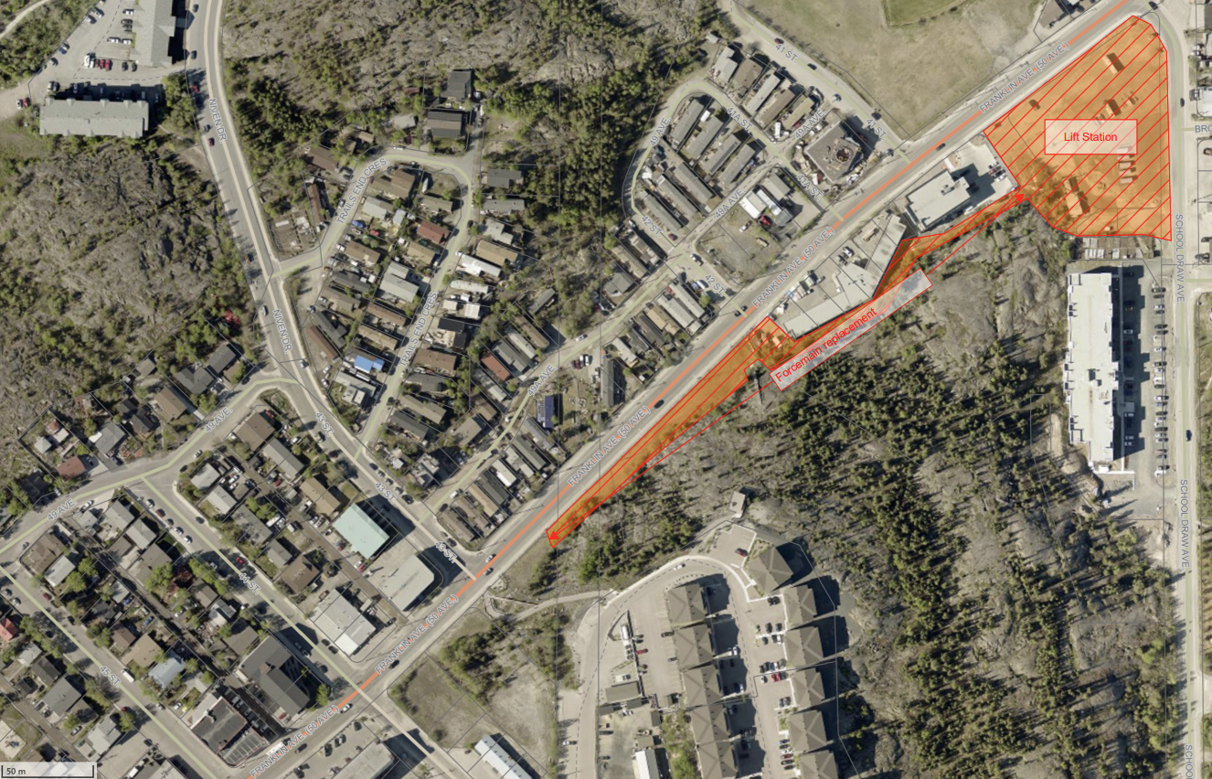 The forcemain, which moves sewage from the lift station up the Franklin Avenue Hill, will be replaced as part of this project. The section being replaced runs from the new lift station to a connection point by the intersection of Franklin Avenue and 44 Street. This work will require lane/road closures on Franklin Avenue and is expected to occur during the spring/summer of 2026. |