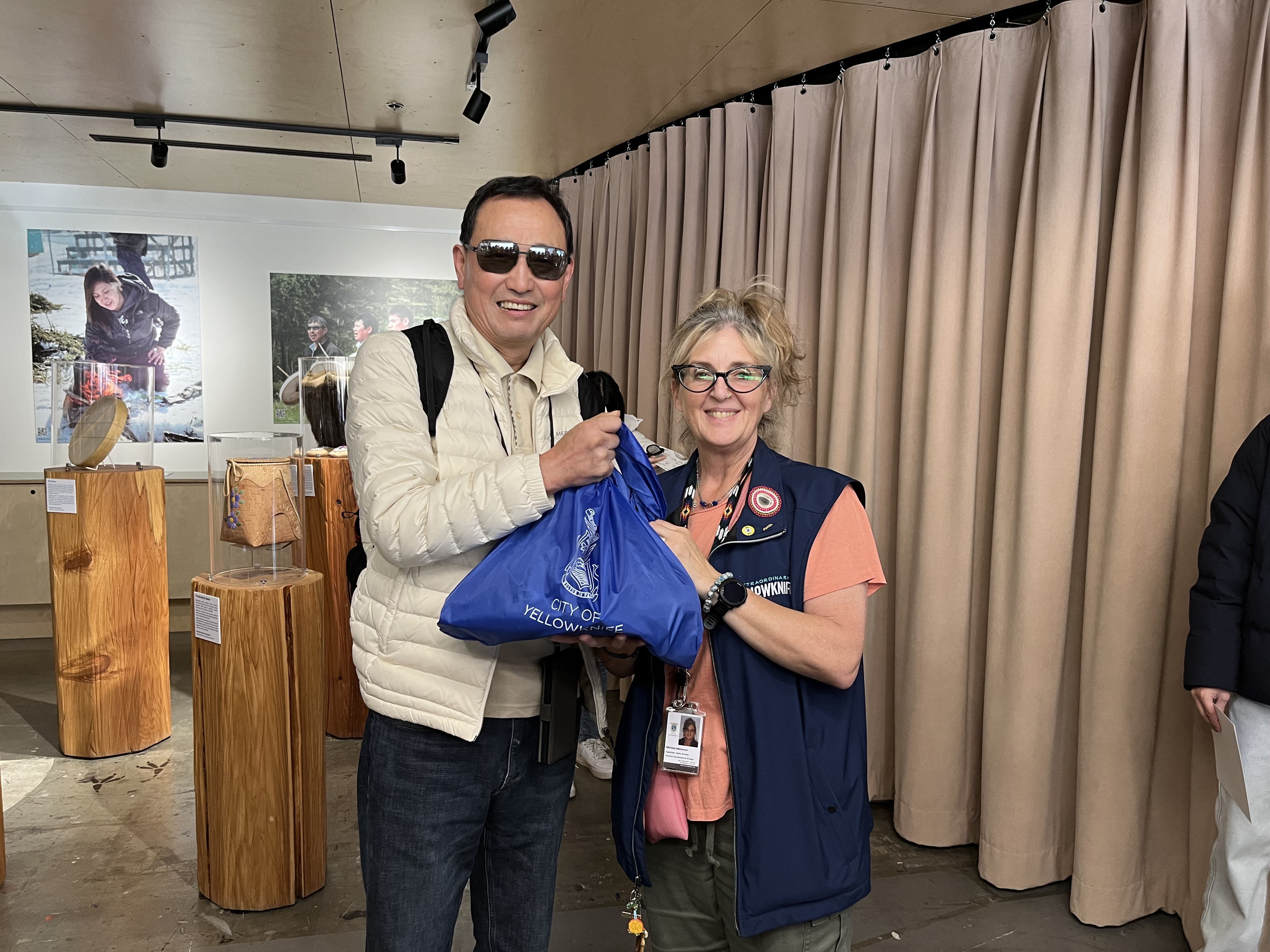 Image: Mr. Park Youngjae is receiving a gift from Ms. Michele Melanson, the supervisor of the Yellowknife Visitor Centre