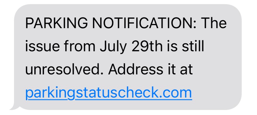 The City has become aware of text messages sent to residents stating a parking issue is not resolved, with a link that leads to an unknown website. These text messages are not being sent from the City, as information from the City regarding enforcement matters would never be communicated in this manner. Residents are advised not to click links from unknown senders and not provide personal information to sources that may be illegitimate.